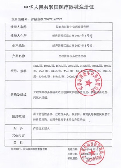 吉械注準(zhǔn)20252140162/長春健投醫(yī)療科技有限公司 有效期至:2030-03-17生理性海水鼻腔清洗液