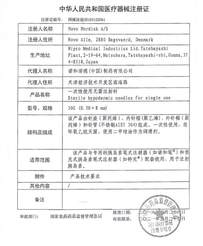 國食藥監(jiān)械(進(jìn))字2014第3154569號(hào)/NanoPass Technologies Ltd. 有效期至:2018-09-29一次性使用無菌注射針