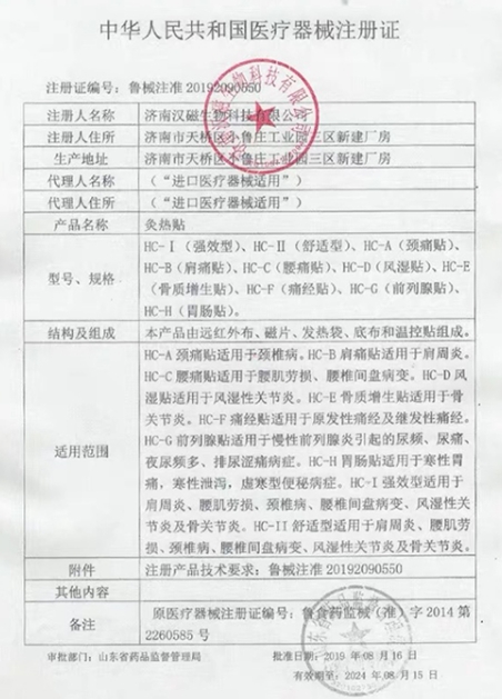 魯食藥監(jiān)械(準(zhǔn))字2014第2260585號(hào)/濟(jì)南漢磁生物科技有限公司 有效期至:2019-08-27灸熱貼