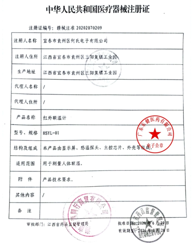 贛械注準20202070224/江西省邁樂醫(yī)療器械有限公司 有效期至:2026-05-07紅外額溫計