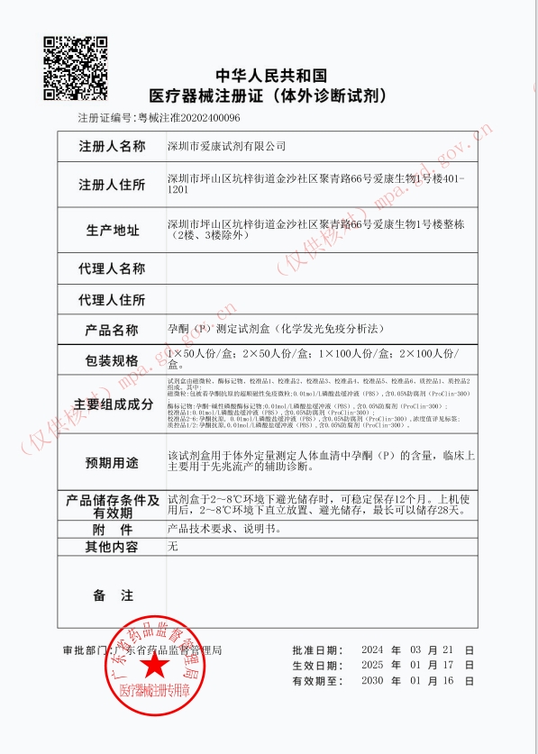 閩械注準(zhǔn)20182400042/福建省洪誠(chéng)生物藥業(yè)有限公司 有效期至:2027-11-13孕酮(P)測(cè)定試劑盒(化學(xué)發(fā)光免疫分析法)