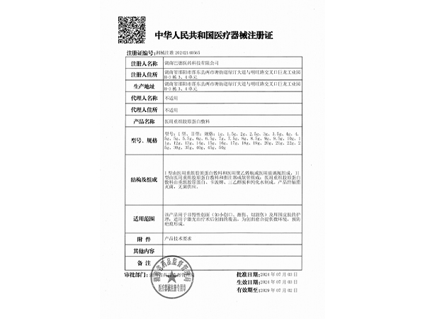 湘械注準(zhǔn)20242140420/啟貞藥業(yè)(湖南)有限公司 有效期至:2029-05-27醫(yī)用重組膠原蛋白敷料