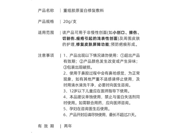 青械注準20232140018/青海創(chuàng)銘醫(yī)療器械有限公司 有效期至:2028-08-29重組膠原蛋白修復敷料