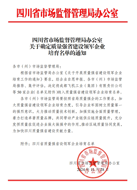 四川省市場(chǎng)監(jiān)督管理局辦公室關(guān)于確定質(zhì)量強(qiáng)省建設(shè)領(lǐng)軍企業(yè)培育名單的通知