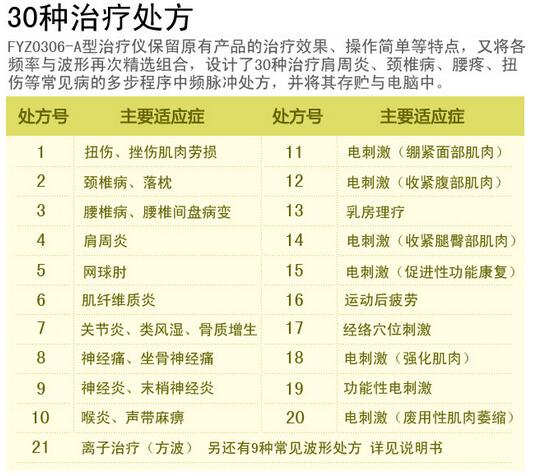 途精心編制而成,其中,多步程序常規(guī)治療處方 20 個(gè),常規(guī)波形處方 9 個(gè),離子
