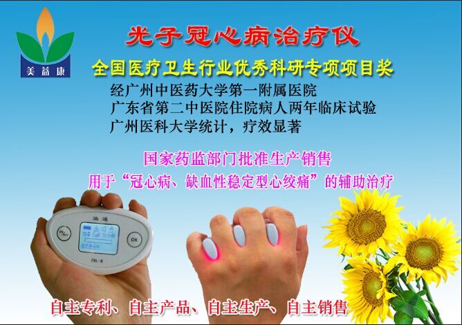 ? ? ??光子冠心病治療儀(心??祻?fù)治療儀)是一種以半導(dǎo)體作為載體、采用650納米波長、使用5毫瓦功率、用于治療冠心病的低能量半導(dǎo)體激光治療儀器。?? ? ??通過照射心包穴、刺激心經(jīng)及心包經(jīng)治療冠心病。屬于國家Ⅱ類醫(yī)療器械產(chǎn)品。