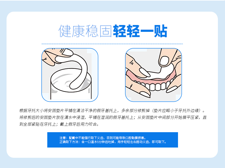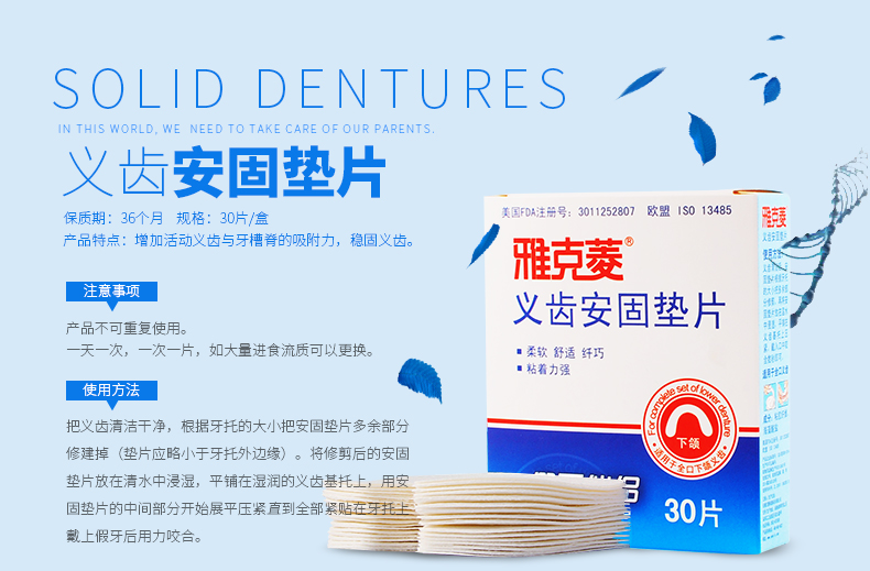 雅克菱假牙安固墊片,專門為牙床萎縮和牙槽嵴低平的老人設(shè)計(jì),能夠有效彌合假牙和牙床之間的縫隙,緩解咀嚼疼痛。目前國內(nèi)假牙護(hù)理產(chǎn)品較少,泡騰片清潔殺菌后,用義齒安固墊片,健康舒適。