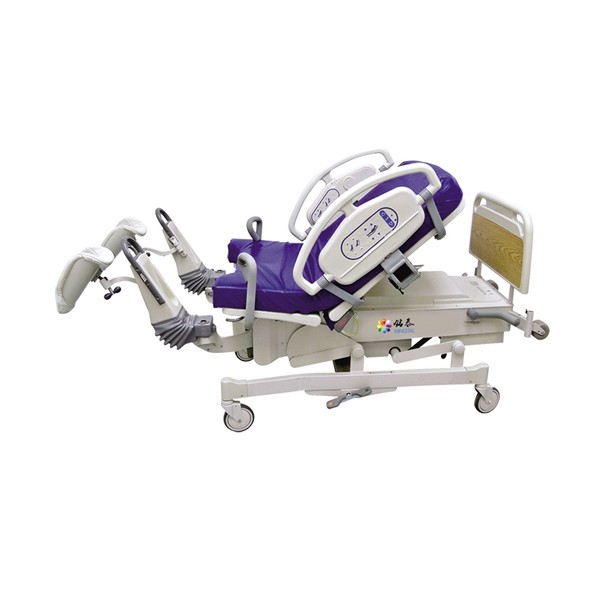 3、床面可整體上升、下降;背板折起,腳板升降為電動(dòng)馬達(dá)控制;座板折起;采用氣彈結(jié)構(gòu),在調(diào)節(jié)范圍內(nèi)角度可任選,以助于產(chǎn)婦順利分娩,腳部床板還可脫卸,床板下有污物盤,兩側(cè)的腿架,隱藏式扶手結(jié)合使用,便于接生工作,整床軟墊可脫卸,便于清洗,為國內(nèi)各大醫(yī)院習(xí)慣所使用。