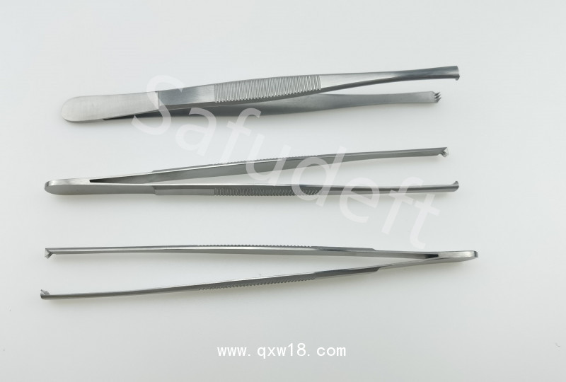 組織鑷也稱有齒鑷,鑷的頂端有鉤齒但無唇頭齒,夾持牢固,但對組織有一定損傷。一般用于夾持皮膚、筋膜、肌肉、腹膜或腫瘤背膜組織等。