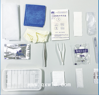 結(jié)構組成:由一次性使用換藥盒、消毒棉球、醫(yī)用塑料組織鑷、醫(yī)用鑷、脫脂棉紗布快(醫(yī)用顯影紗布塊)、橡膠檢查手套、PE手套、塑柄手術刀/刀片、包單組成。