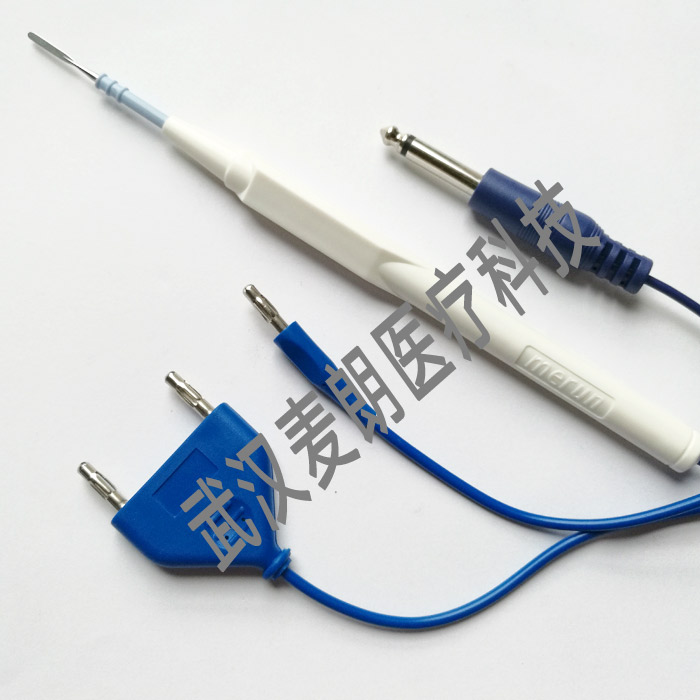 一次性手控型電刀筆:主要由絕緣套管、手術(shù)電及、手控按鈕開關(guān)、塑料柄部、電纜線及插頭組成。