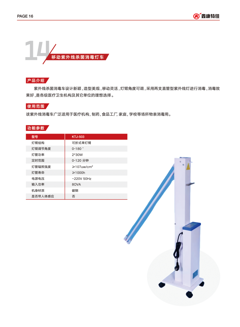 紫外線殺菌消毒車設(shè)計(jì)新穎,造型美觀,移動(dòng)靈活,燈臂角度可調(diào),采用兩支直管型紫外線燈進(jìn)行消毒,消毒效果好,是各級(jí)醫(yī)療衛(wèi)生機(jī)構(gòu)及其它單位的理想選擇