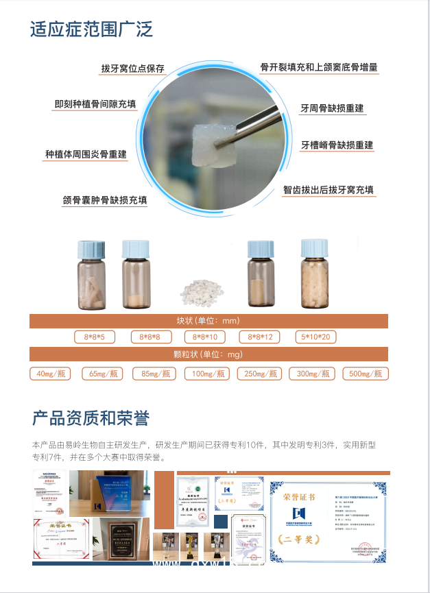 適用范圍 產(chǎn)品與骨填充材料聯(lián)合使用,起物理阻隔作用, 防止充 填材料移動(dòng), 包括: 拔牙后、殘根拔除術(shù)后拔牙窩填 充; 牙槽嵴恢復(fù); 牙周疾病引起的牙槽骨缺損修復(fù)。